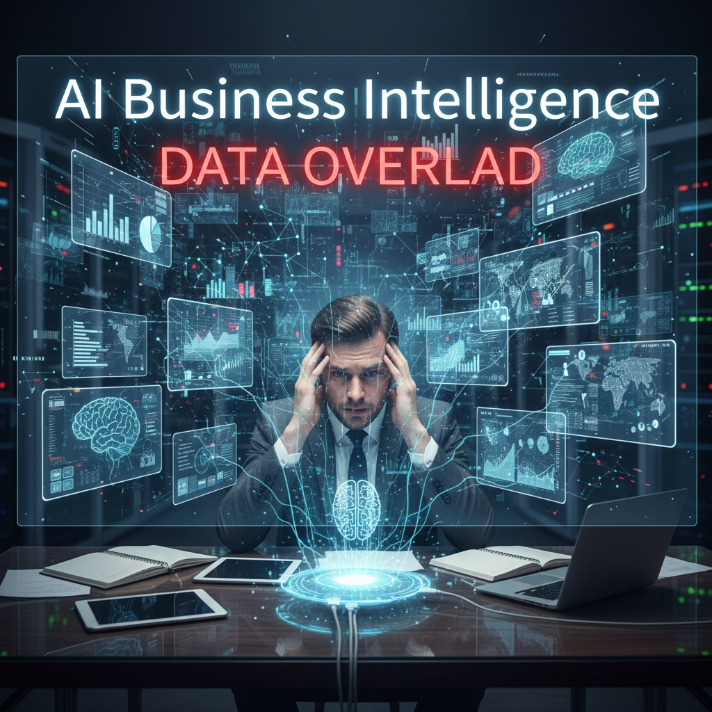 Photo: Executive overwhelmed by AI business intelligence complexity, illustrating the confusion and pressure leaders face with complex data streams and expectations.