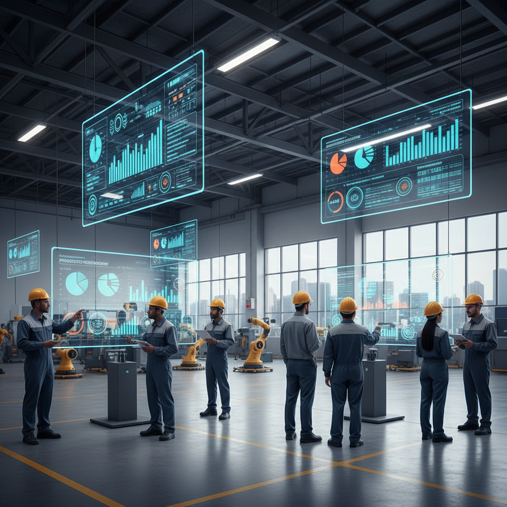 Photo: Factory floor with digital overlays showing efficiency gains, workers collaborating with AI dashboards—symbolizing AI BI success in manufacturing.
