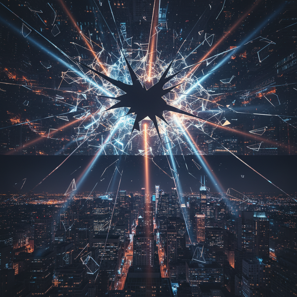 Photo: Shattered glass ceiling with data points bursting upward—symbolizing breaking barriers in enterprise AI business intelligence.