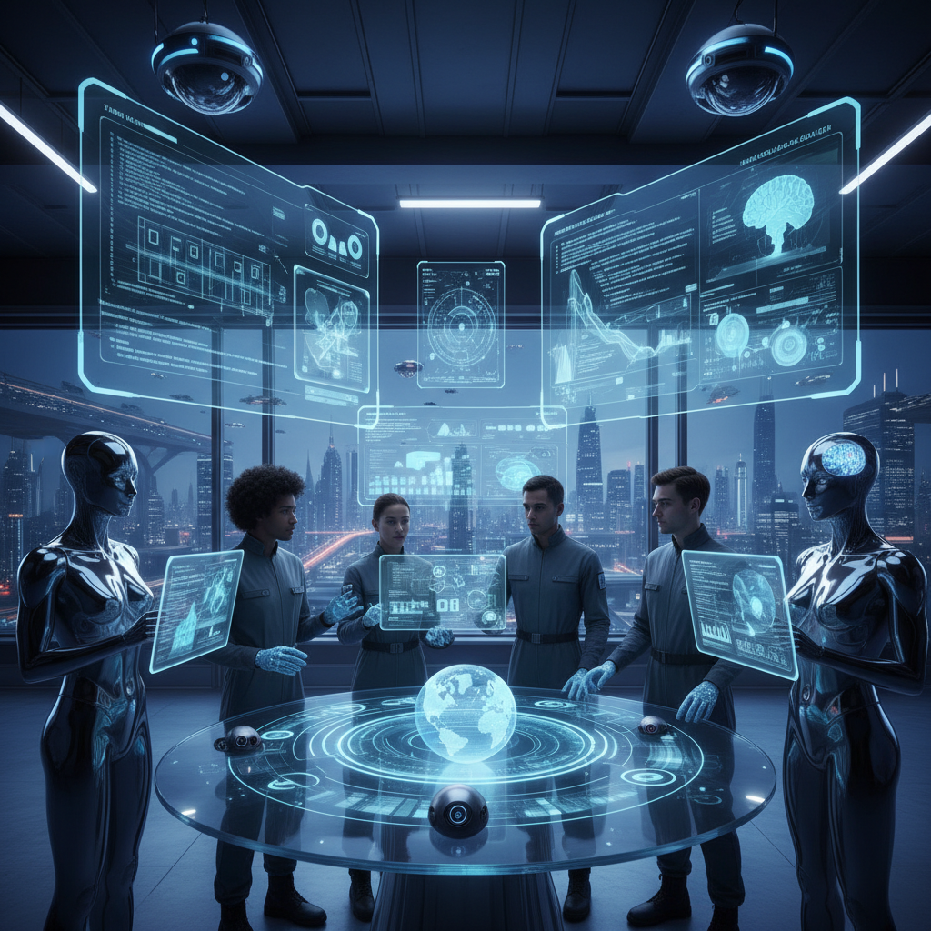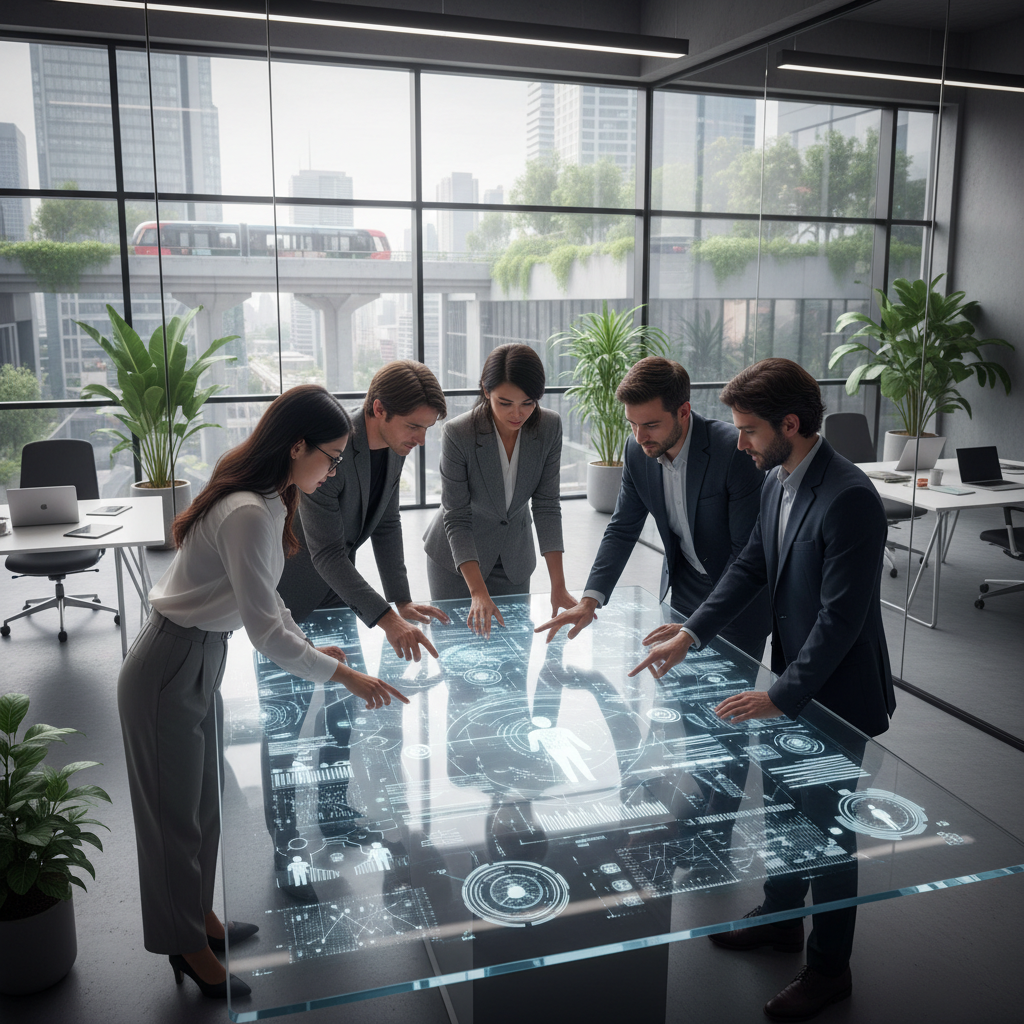 Diverse team collaborating with a visible AI system, depicting how enterprise AI collaboration software integrates into daily routines