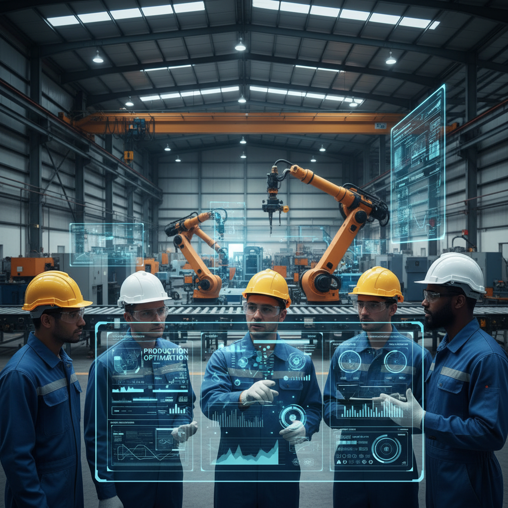 Factory team using AI collaboration dashboard, showcasing AI adoption beyond the office and into industrial environments