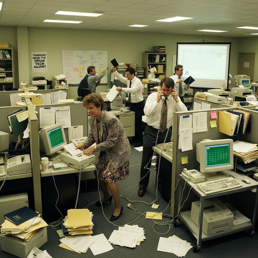 Frustrated office workers using outdated collaboration software, surrounded by paper and old computers, highlighting legacy system pain points