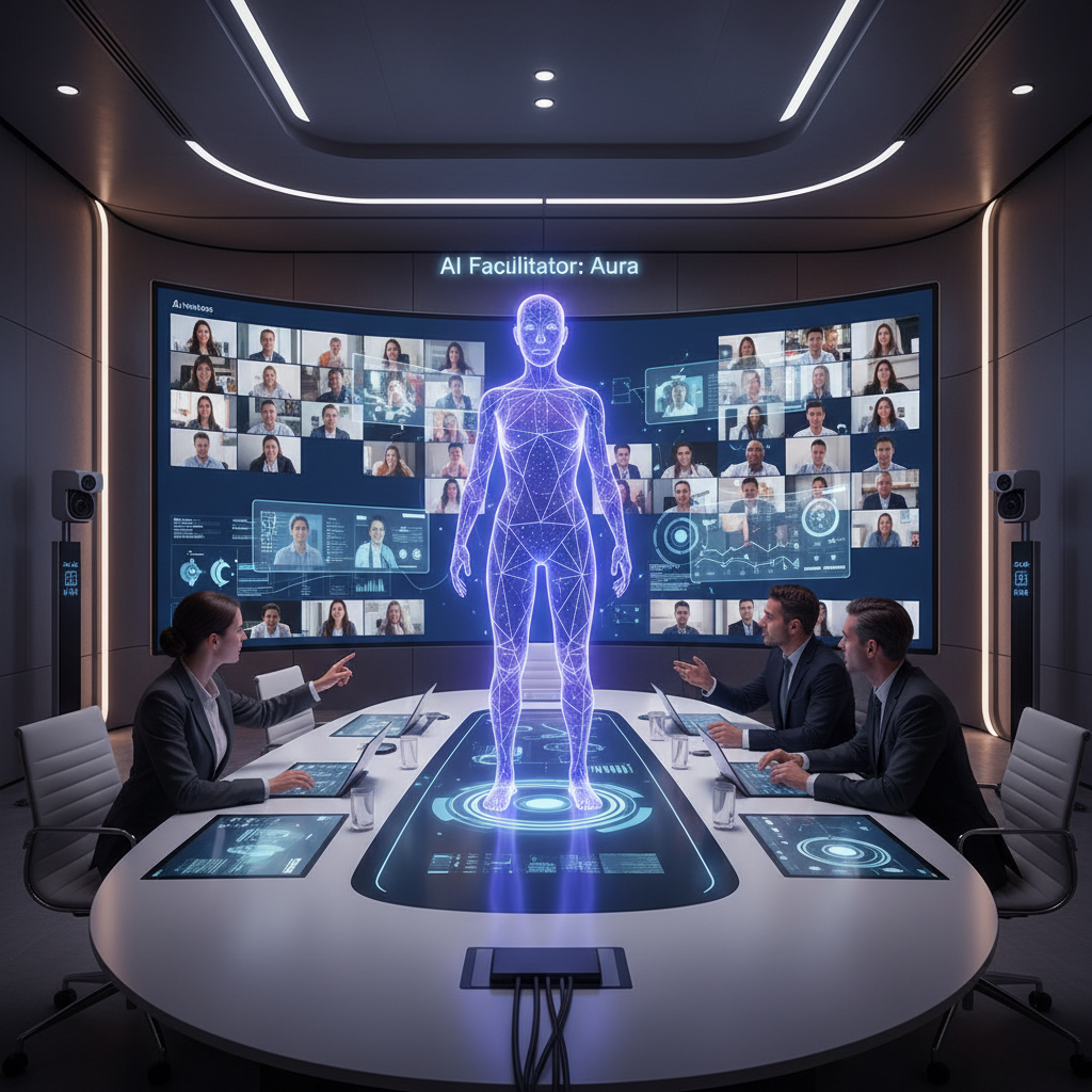Hybrid meeting with AI teammate avatar, illustrating modern, blended collaboration powered by intelligent AI software