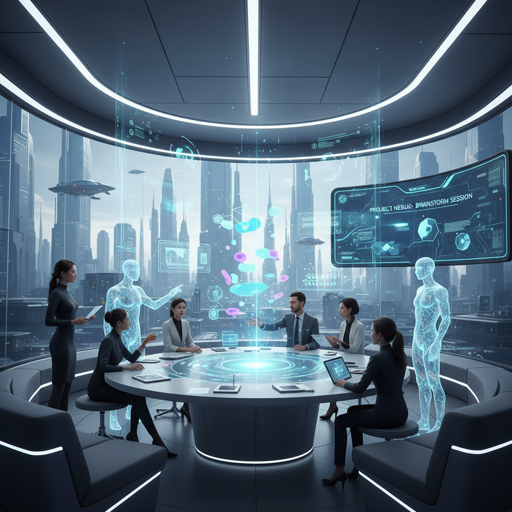Alt: Futuristic team collaborating with AI, visualizing the evolution of enterprise AI-enabled solutions