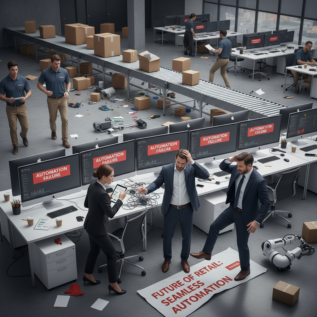 Executives and team members review the aftermath of a failed AI automation rollout in a retail setting—wasted inventory, lost revenue.