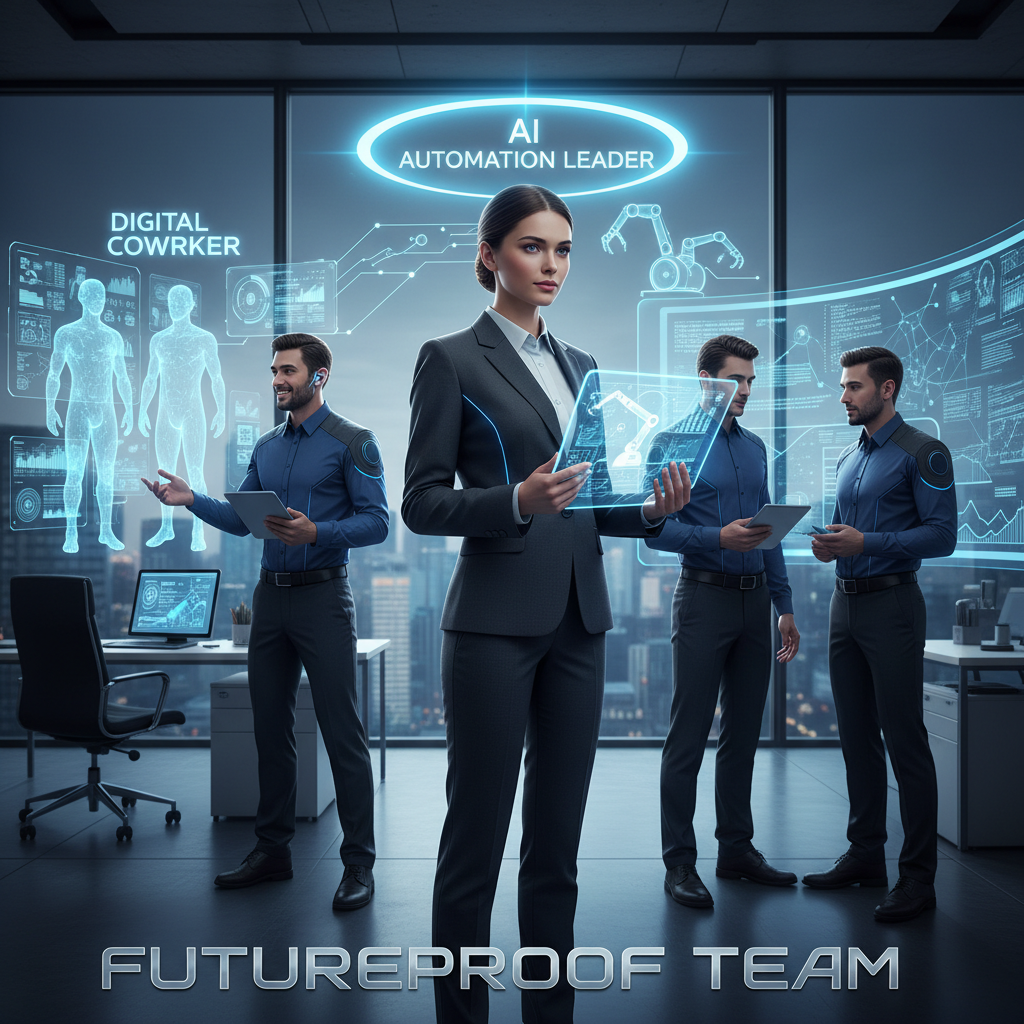 A confident team leader guides their team through the challenges of AI-powered automation, with a digital coworker visible on screen.