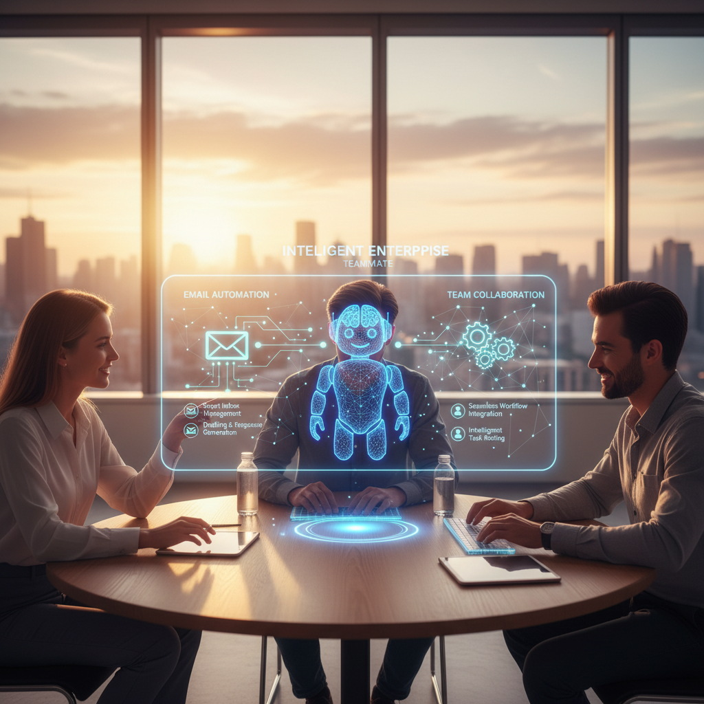An AI-powered digital coworker manages emails, tasks, and collaboration in a bustling enterprise inbox.