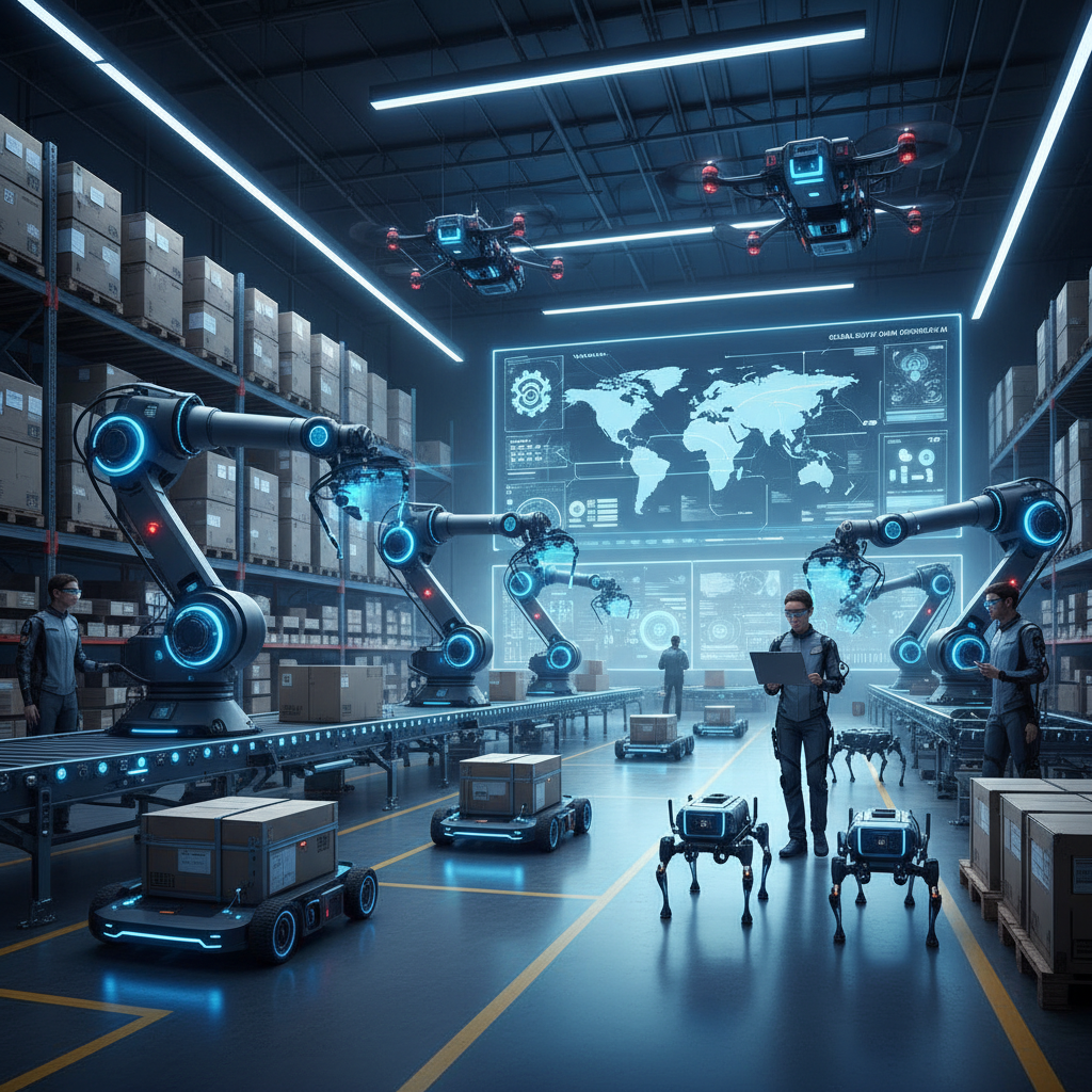 AI-powered warehouse with robots and human workers collaborating, epitomizing successful enterprise AI implementation
