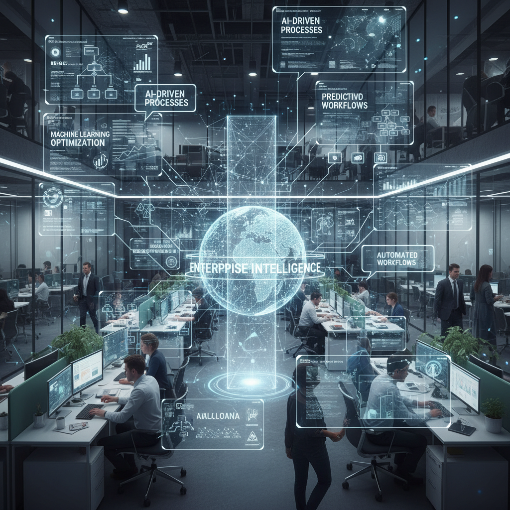 Bustling office scene with digital overlays exposing hidden AI-driven enterprise processes in action