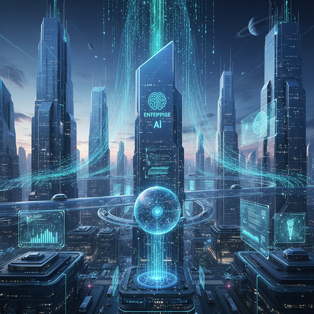 Futuristic skyline with digital data streams weaving through buildings, signifying the evolution of enterprise AI-powered solutions