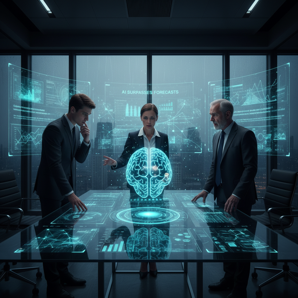 Moody corporate setting: executives scrutinizing AI-powered digital overlays, symbolizing enterprise AI-powered enterprise solutions obsession