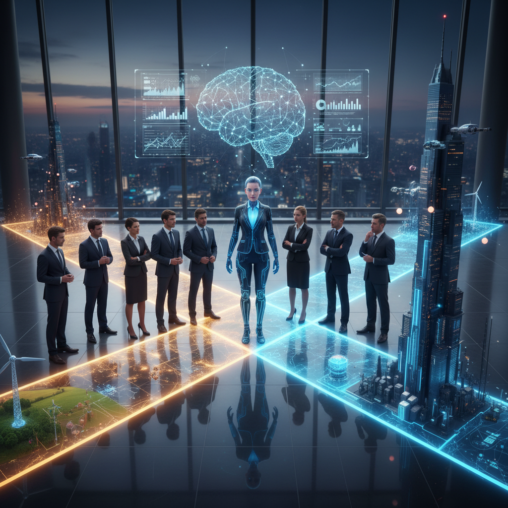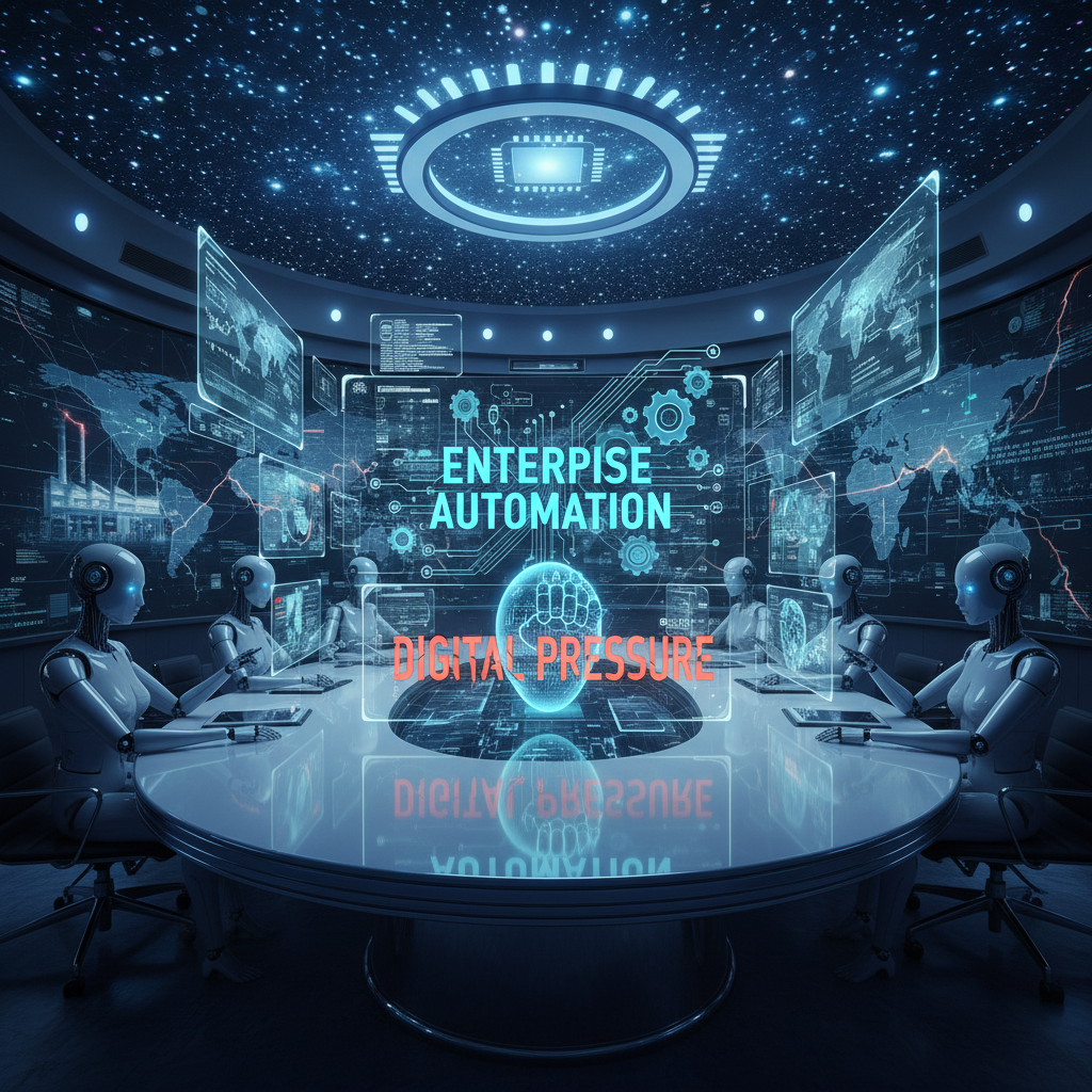 Editorial, high-contrast photo of a crowded boardroom with AI projections overlaying anxious executives. Alt: Boardroom under AI transformation pressure