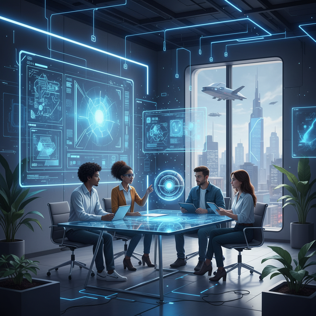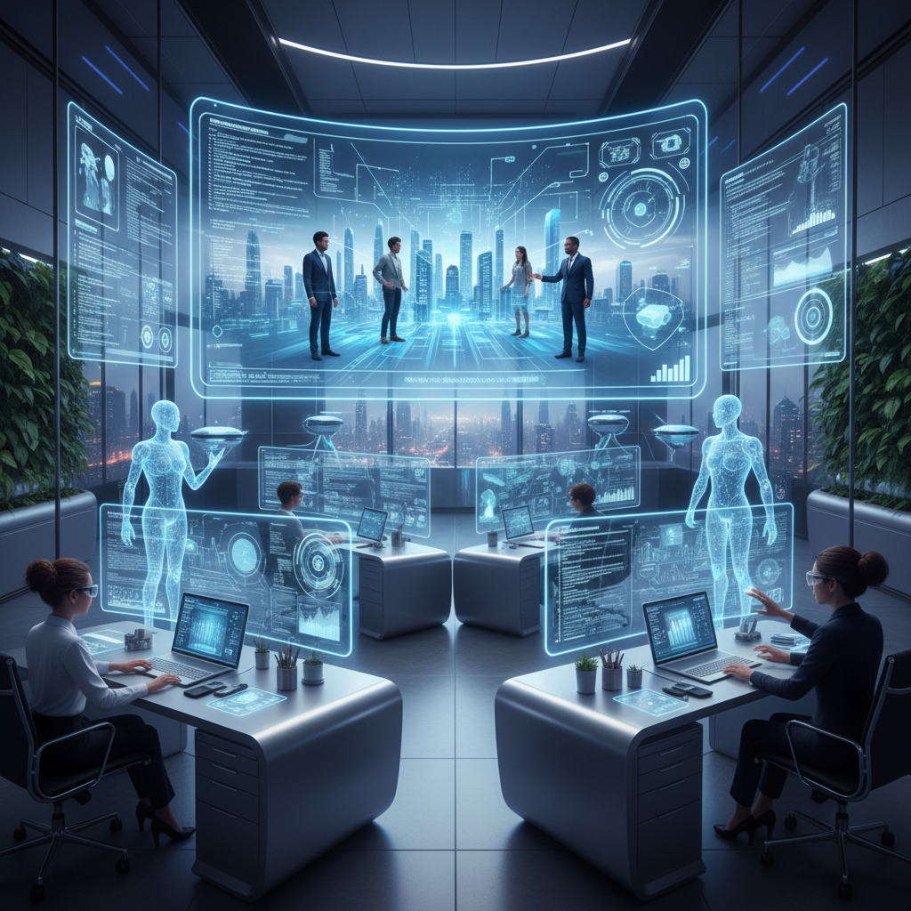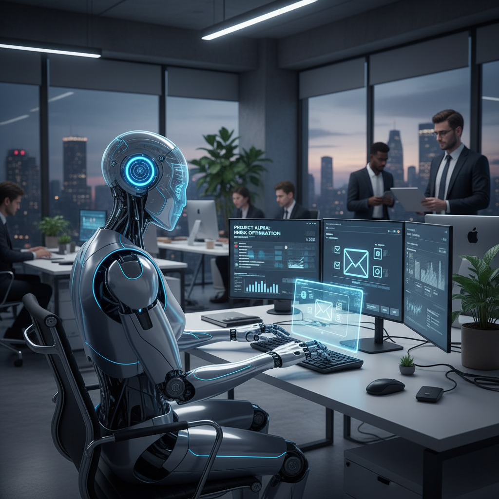 Alt text: Office of the future with AI and humans collaborating on digital workspaces, illustrating the evolution of enterprise email productivity app use.