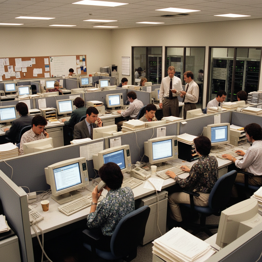 Alt text: Overwhelmed office workers in the 1990s surrounded by paper and early computers, symbolizing the rise of enterprise email productivity app reliance.