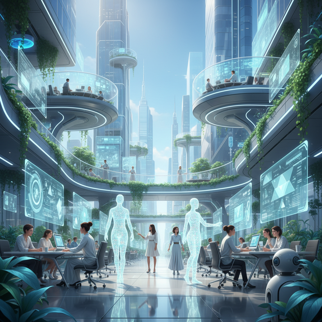 Alt text: Futuristic office scene with digital and human coworkers collaborating, symbolizing the next wave of enterprise operational efficiency AI.