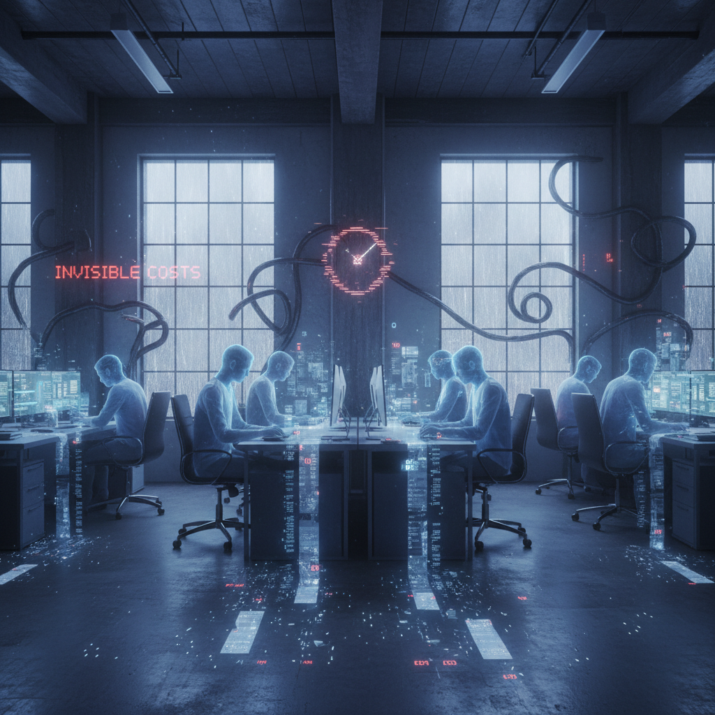 Alt text: Office scene showing invisible digital costs floating around workers, symbolizing hidden AI adoption expenses.