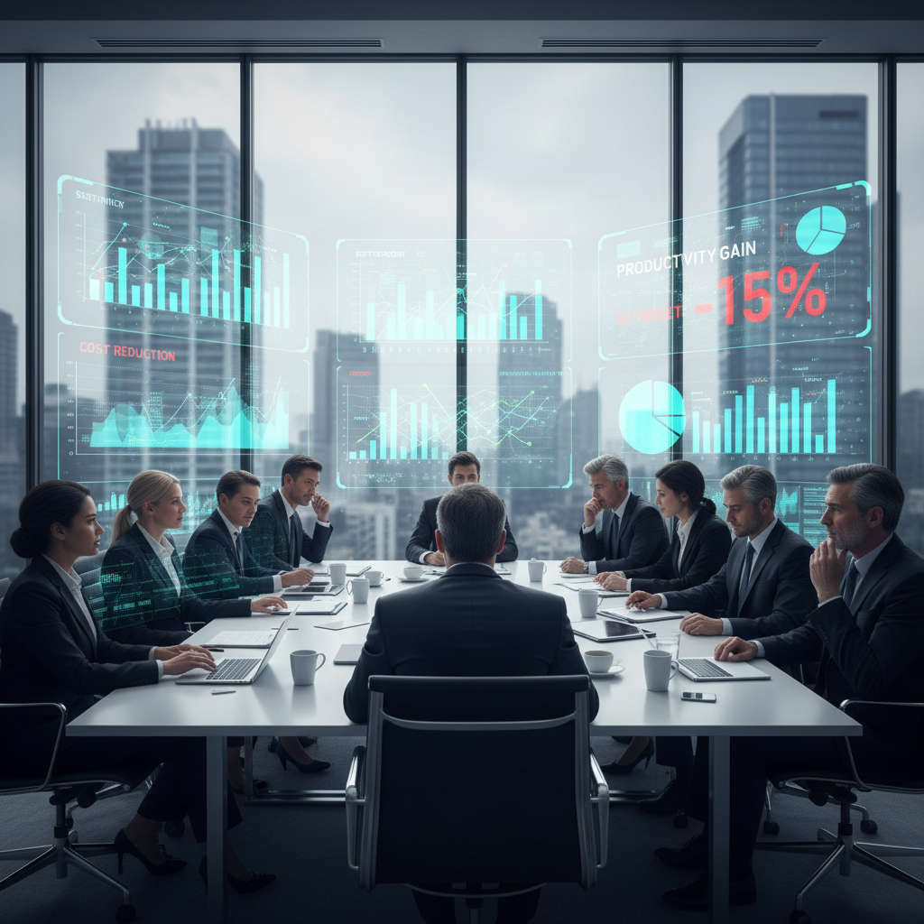 Alt text: Modern boardroom with AI-generated efficiency dashboards and executives reviewing operational metrics.