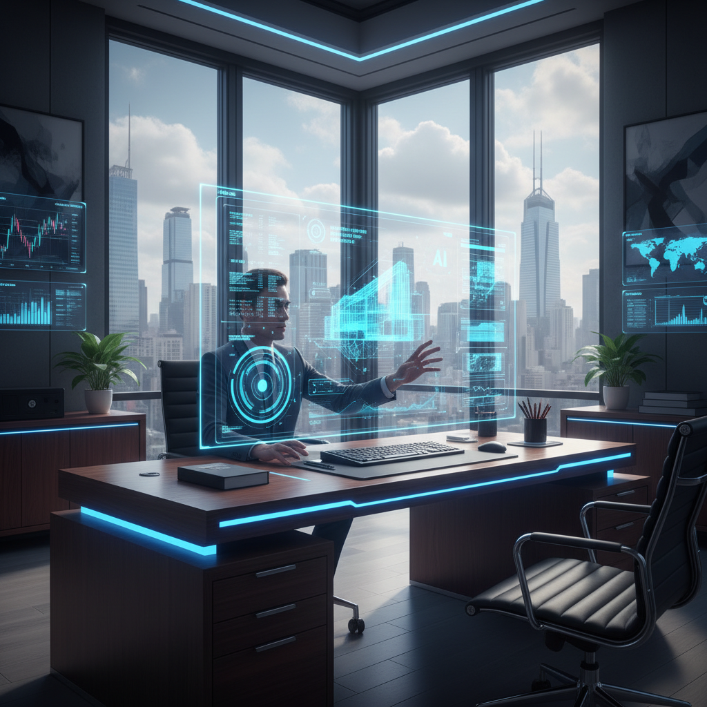 A futuristic AI interface overlays a classic executive workspace, illustrating the blend of tradition and innovation in executive support.