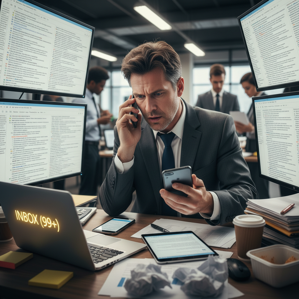 An overwhelmed executive juggles multiple devices and emails, illustrating the hidden workload in modern executive roles.