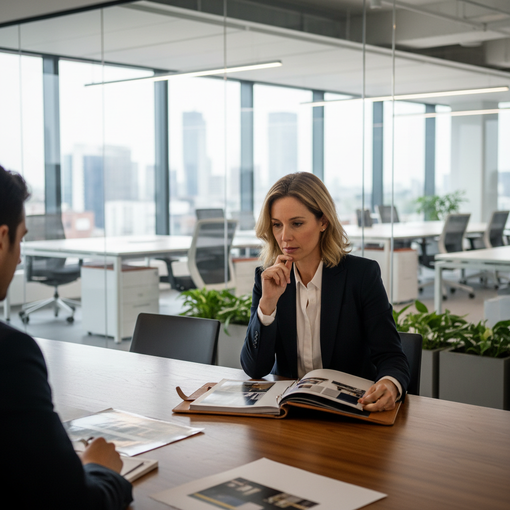 Alt text: Experienced professional evaluating a peer’s portfolio for genuine expertise