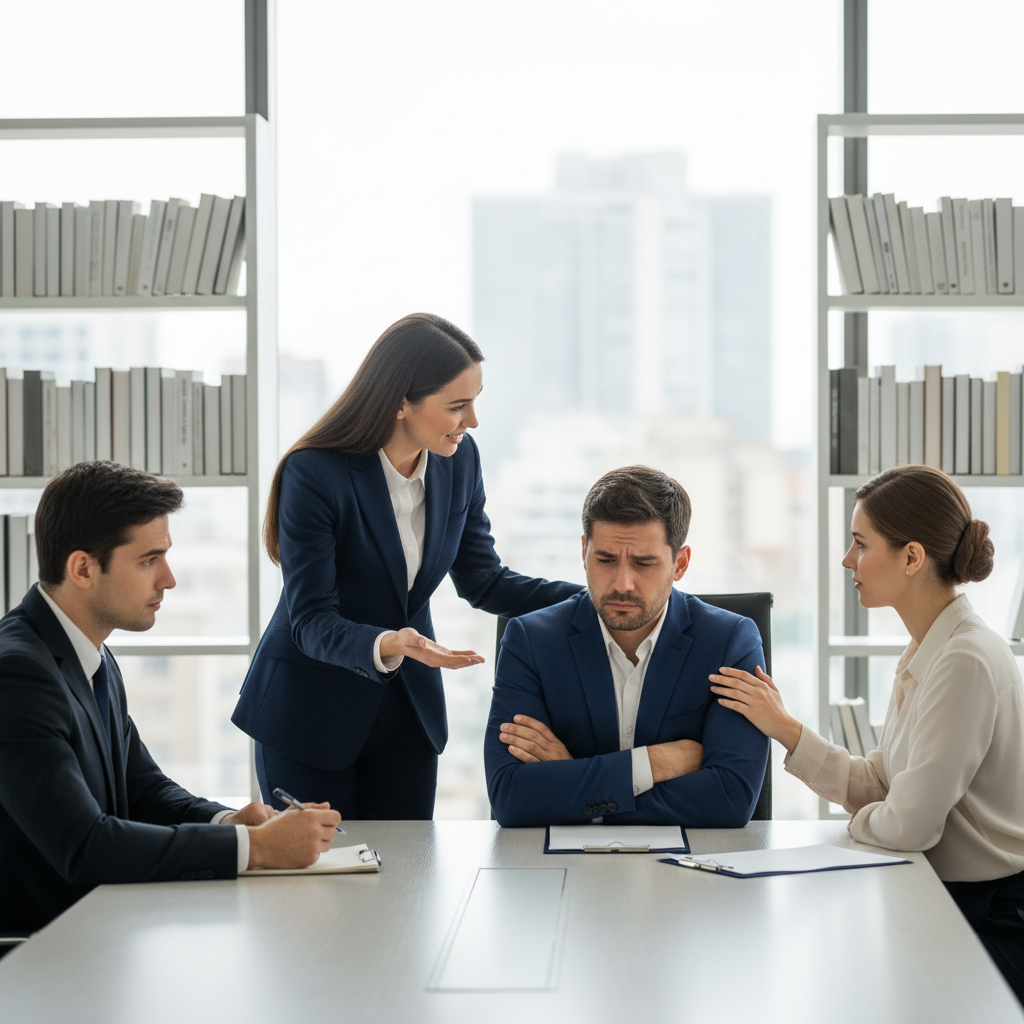 Alt text: Experienced professional using emotional intelligence to mediate a tense workplace meeting