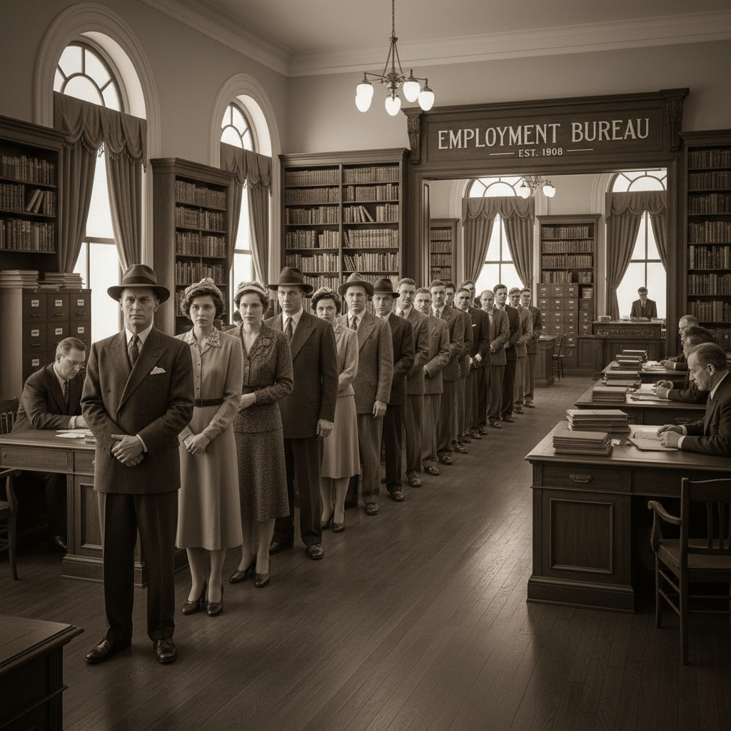 Alt text: Vintage office with anxious job applicants, representing traditional value of experienced professionals