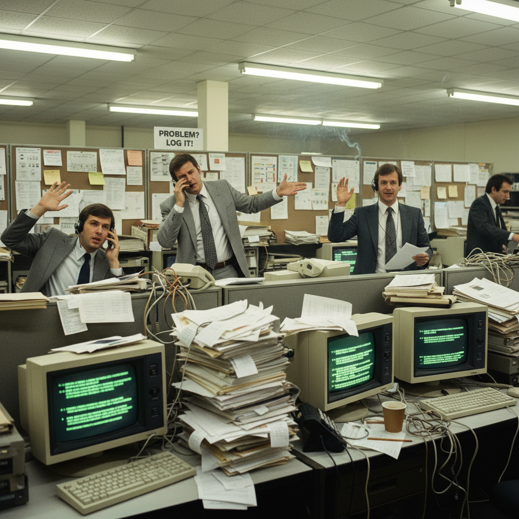 Alt text: 1980s tech support helpdesk in chaos with CRT screens, paper tickets, and stressed staff