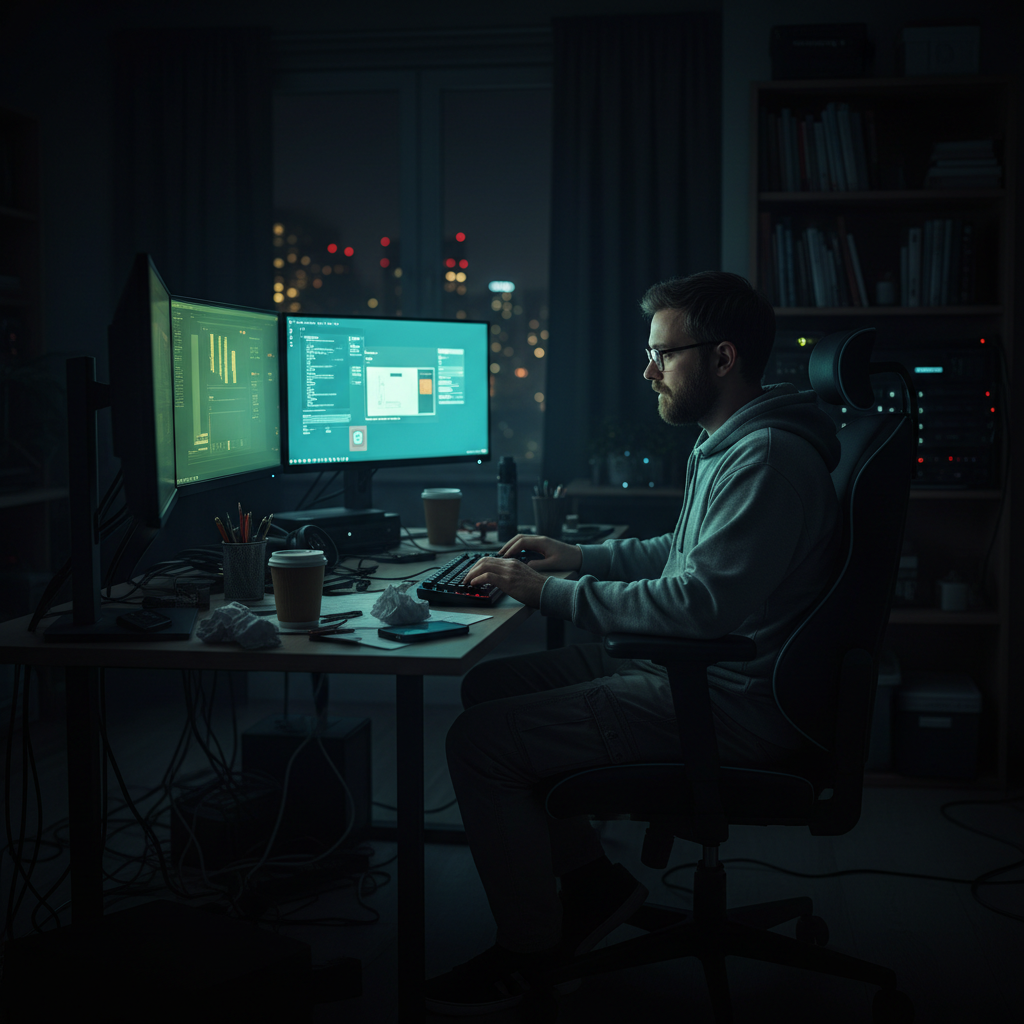 Alt text: Freelancer tech support at night, glowing screens and dark workspace