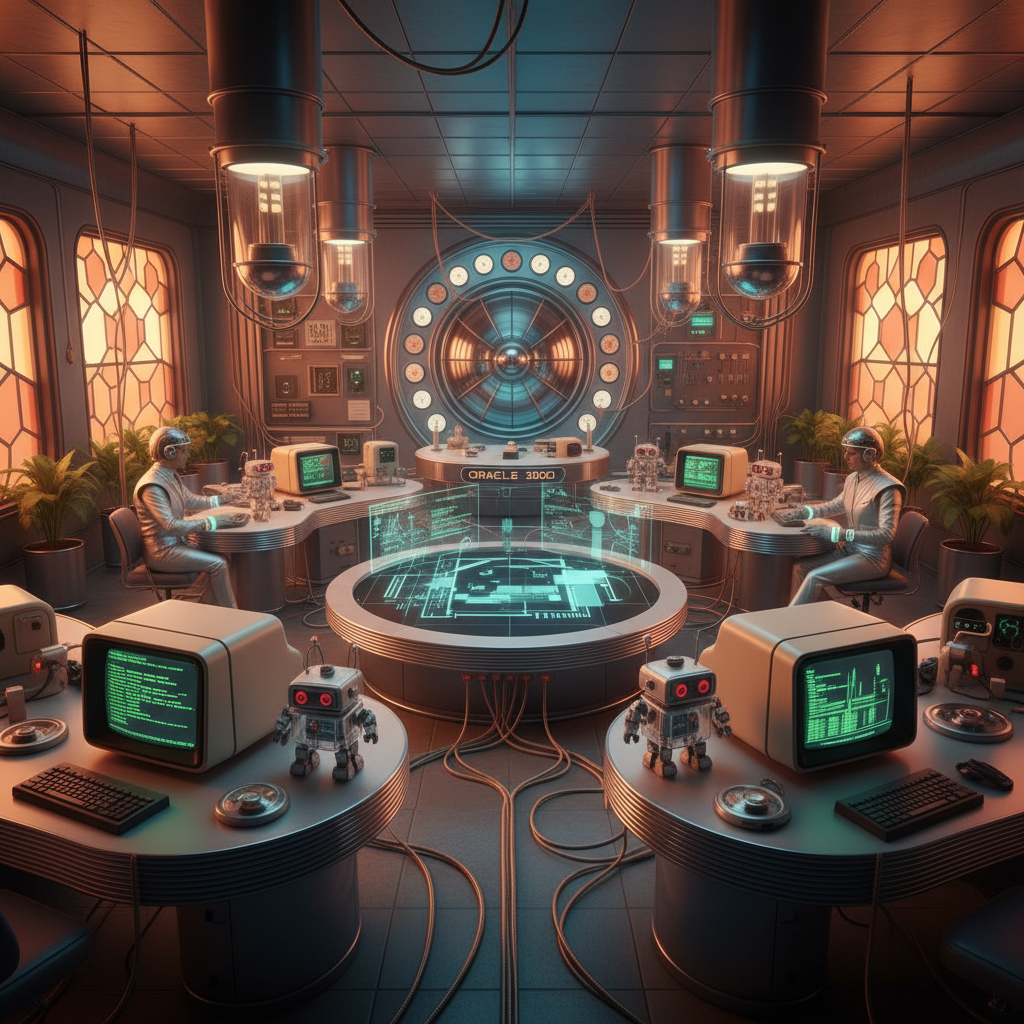 Alt text: Early enterprise digital helpers in action, professionals using vintage computers and automation tools