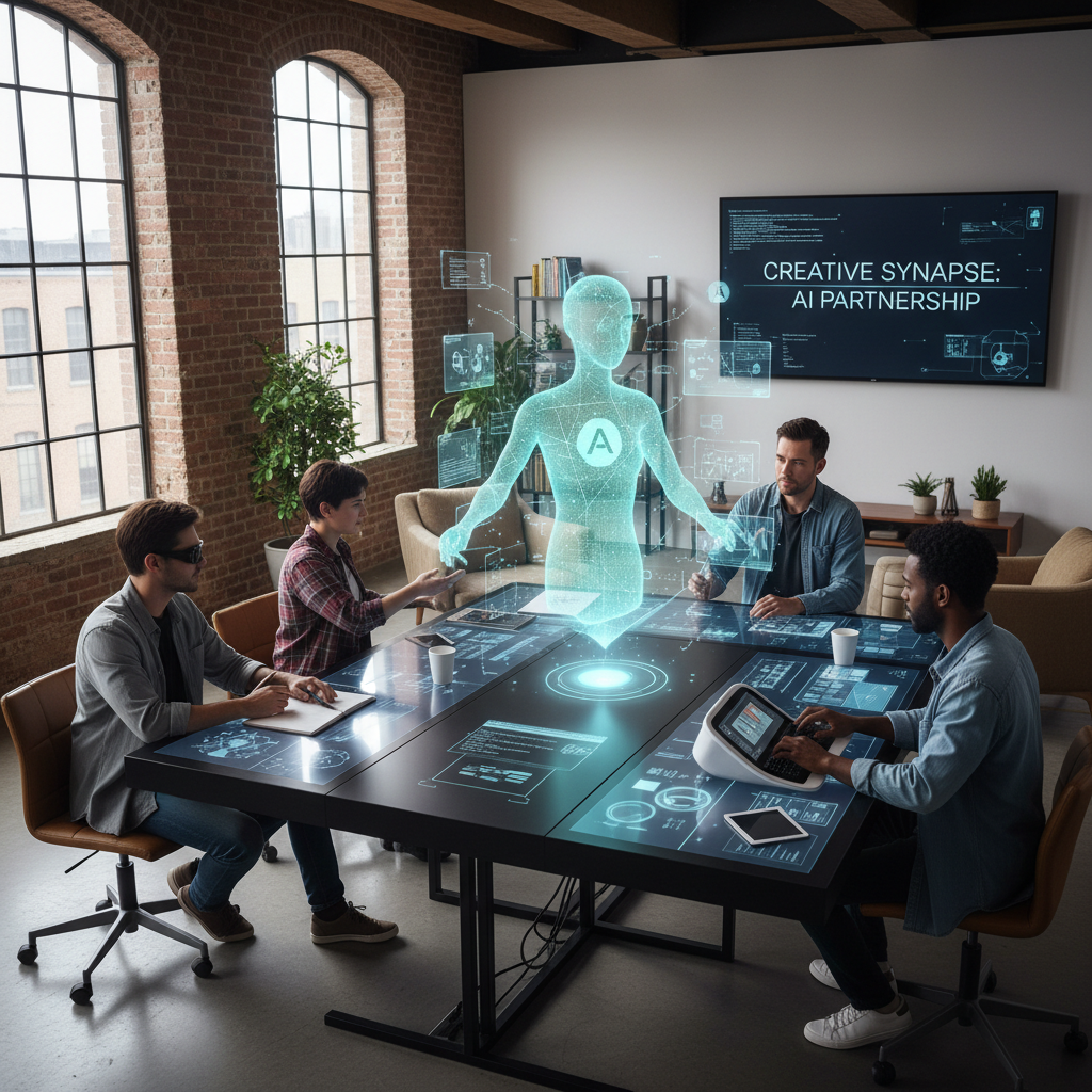 Alt: Creative professionals collaborating with digital assistant in real time, flexible assistant in creative industries