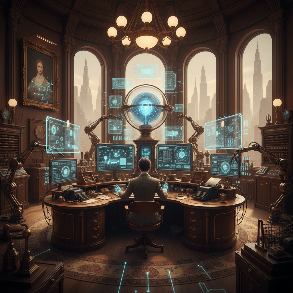 Alt: Historical transition from traditional office assistant to digital AI-powered workspace, flexible assistant evolution