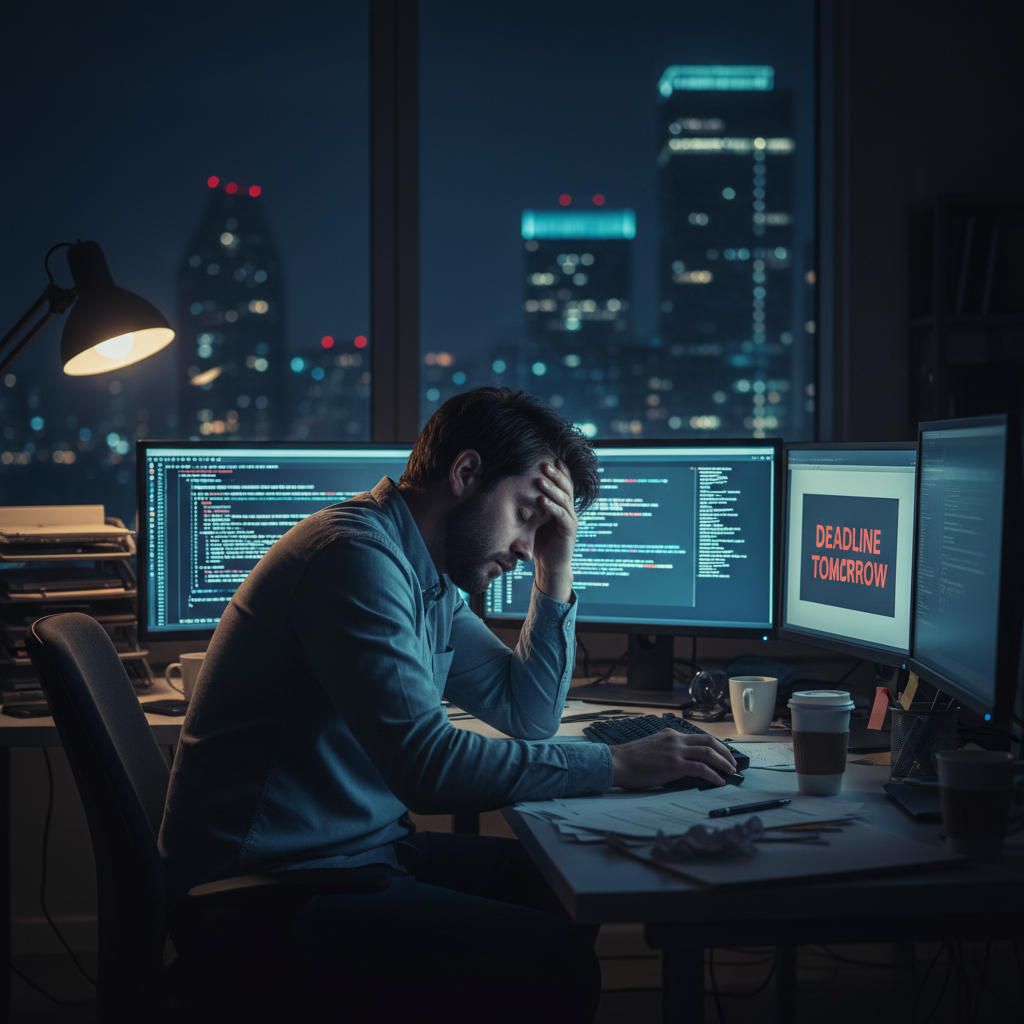 Descriptive alt text: Exhausted office worker at night in front of glowing monitors, illustrating the toll of poor email habits and inbox overload.