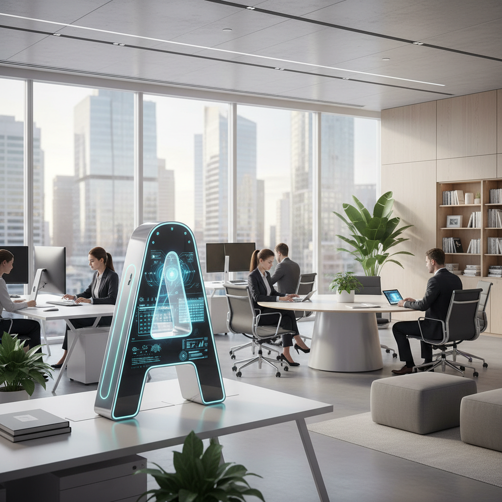 Descriptive alt text: Digital assistant subtly present in a professional office, highlighting AI teammate's role in email management and collaboration.