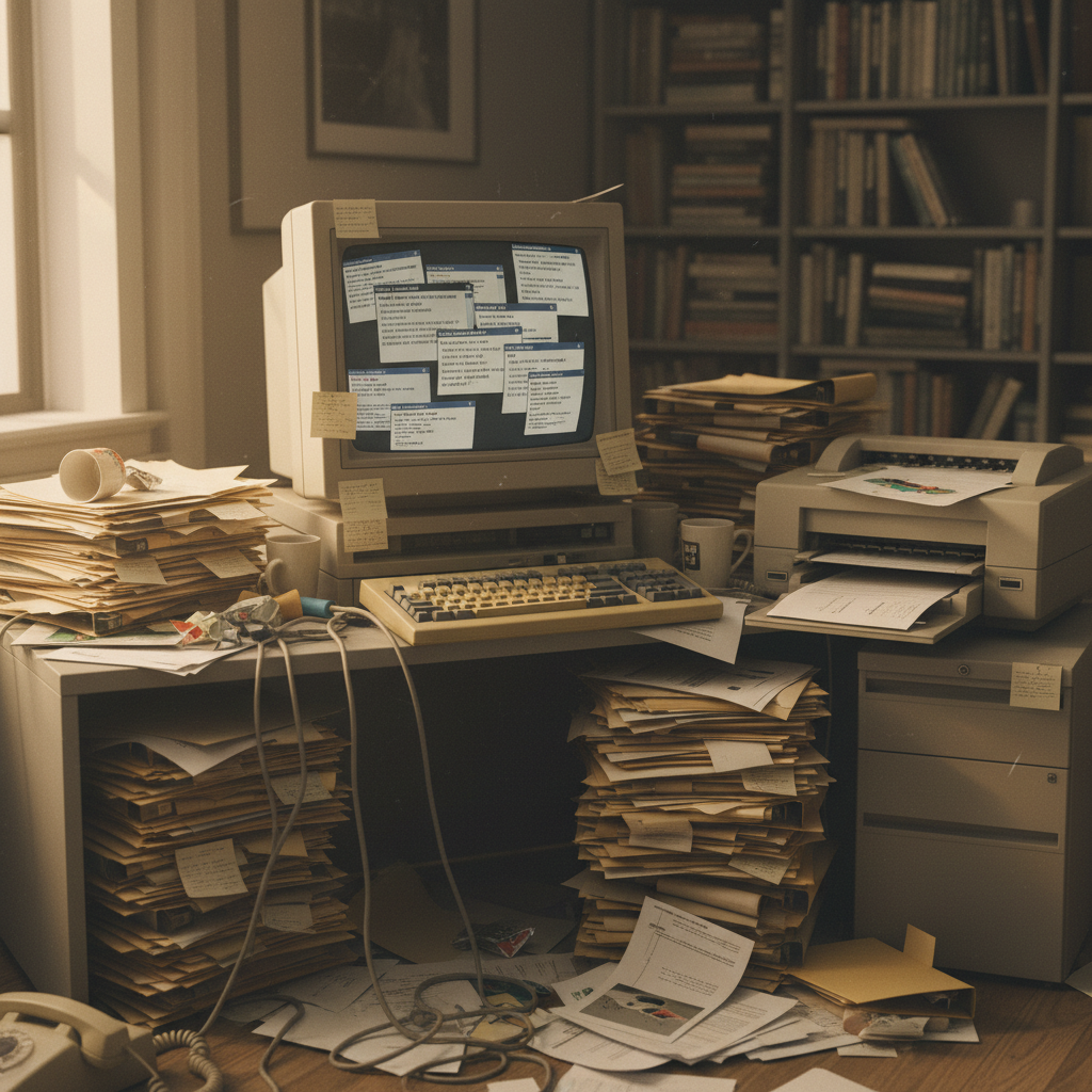 Descriptive alt text: Vintage computer setup with overflowing papers, symbolizing the origins and collapse of email sanity, email management and inbox overload.