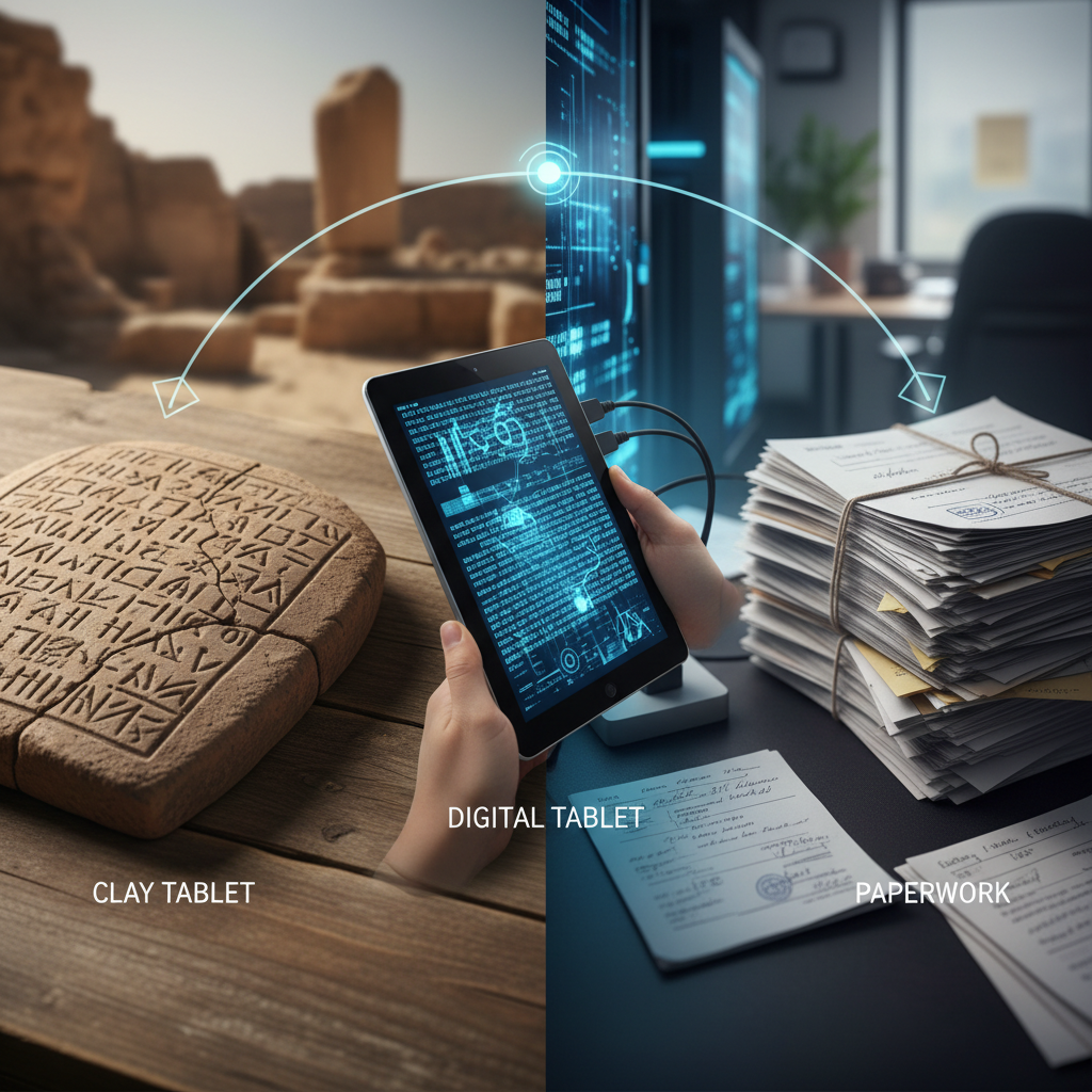 Table 1: Timeline of paperwork innovations from clay tablets to AI—each step multiplying, not reducing, admin complexity. Source: Original analysis based on Adobe, 2016, CRPE, 2025.