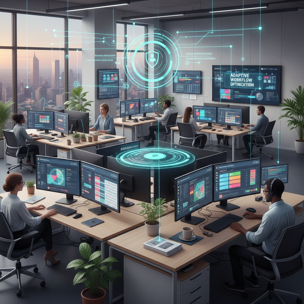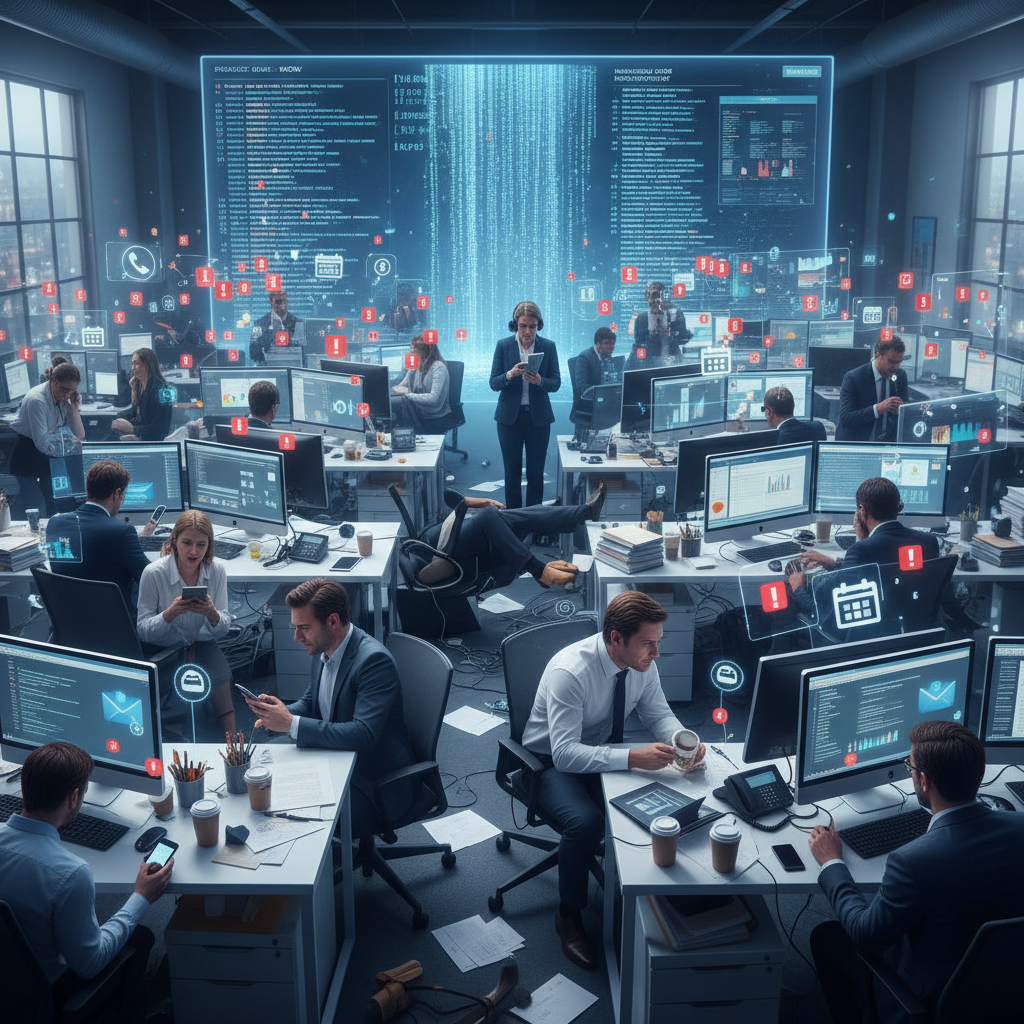Alt: Staff overwhelmed by task chaos in a modern office environment