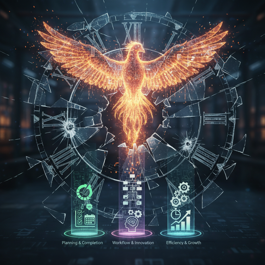 Alt: Breaking old staff task habits for a new era, shattered clock and digital phoenix rising