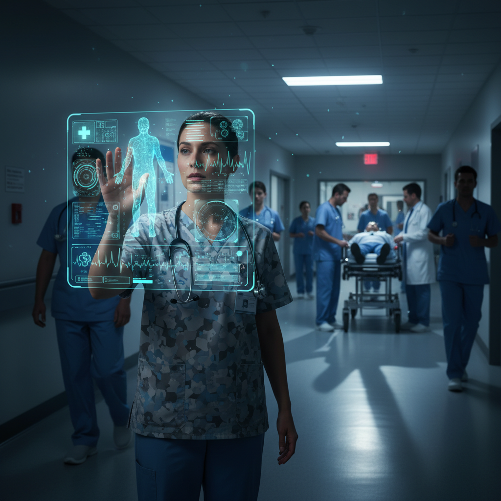 Picture three parallel stories at dawn in a major hospital. The human healthcare assistant hustles between patients, changing linens, checking pulses, and offering a steadying hand to the anxious. Meanwhile, an AI assistant trawls through vital signs, instantly flagging deteriorating patients, sorting medication requests, and pinging reminders to every device in the building. In a blended team, the human and AI coordinate—one reading the room, the other reading the data.