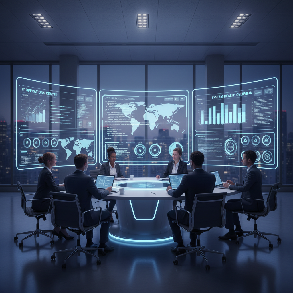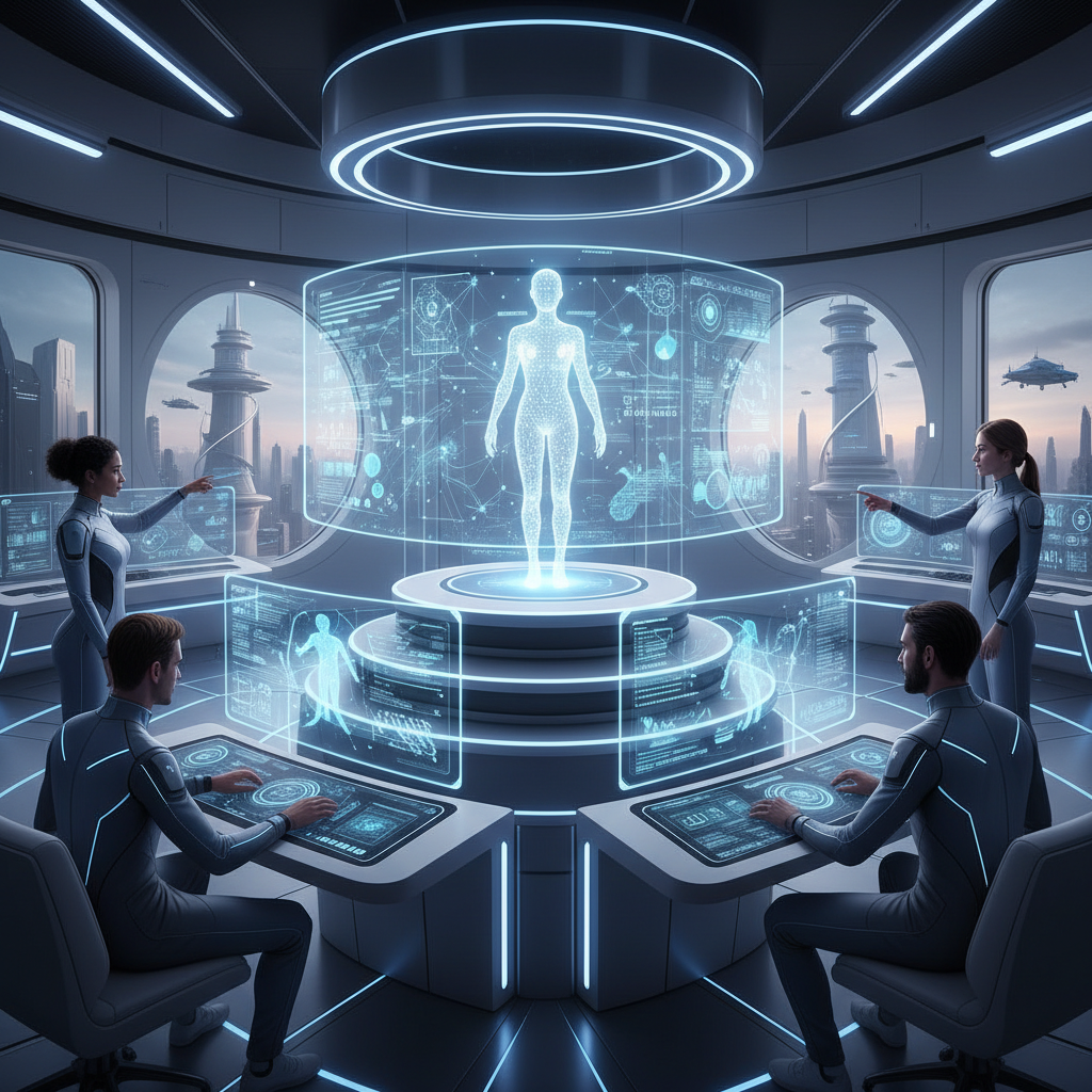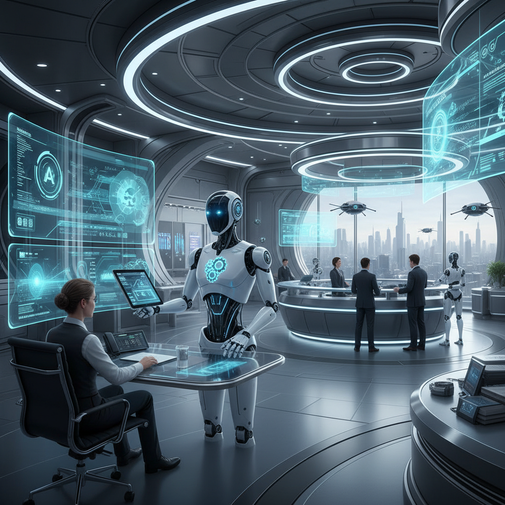 Alt text: Futuristic enterprise help desk with holographic AI-powered teammates.
