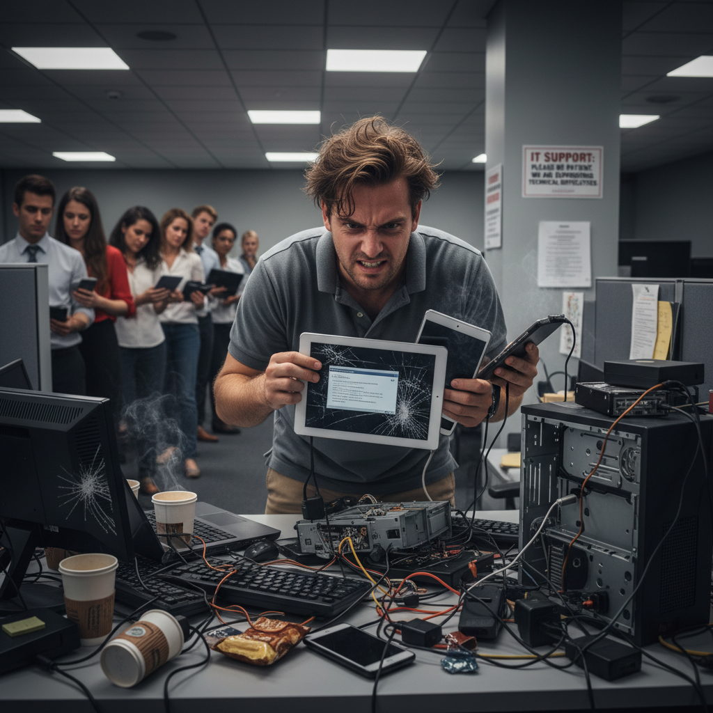 Alt text: Overwhelmed worker facing IT breakdown, help desk support crisis.