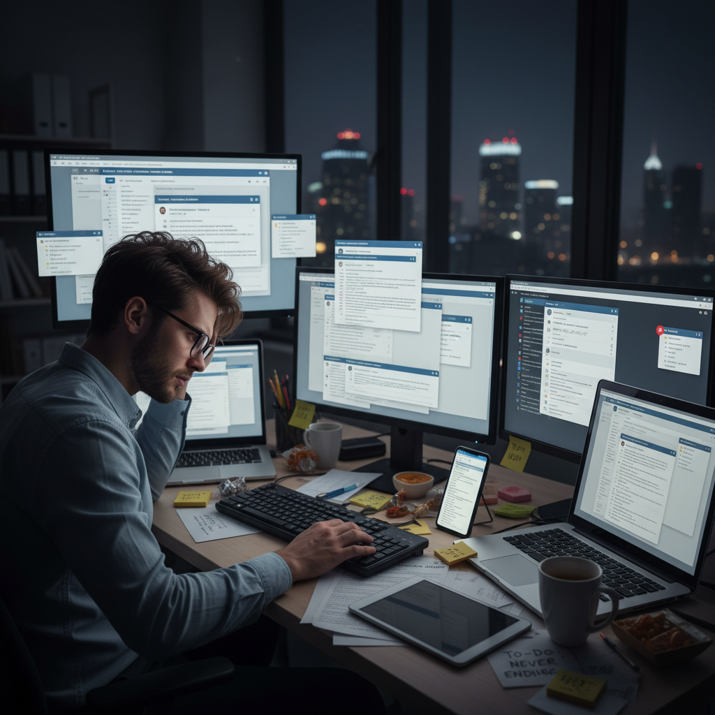 - 24/7 urgency: Messages timestamped at midnight, and the implicit expectation to respond instantly. This breeds a cycle of anxiety and loss of work-life boundaries.