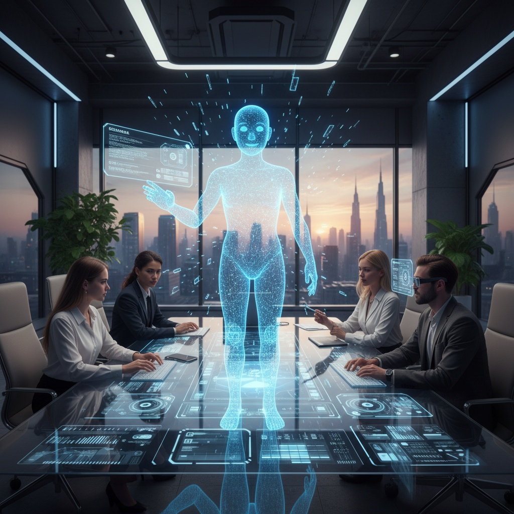 Image: An AI-powered digital coworker collaborating dynamically in a modern, high-pressure office setting, illustrating the demand for efficient helpers.