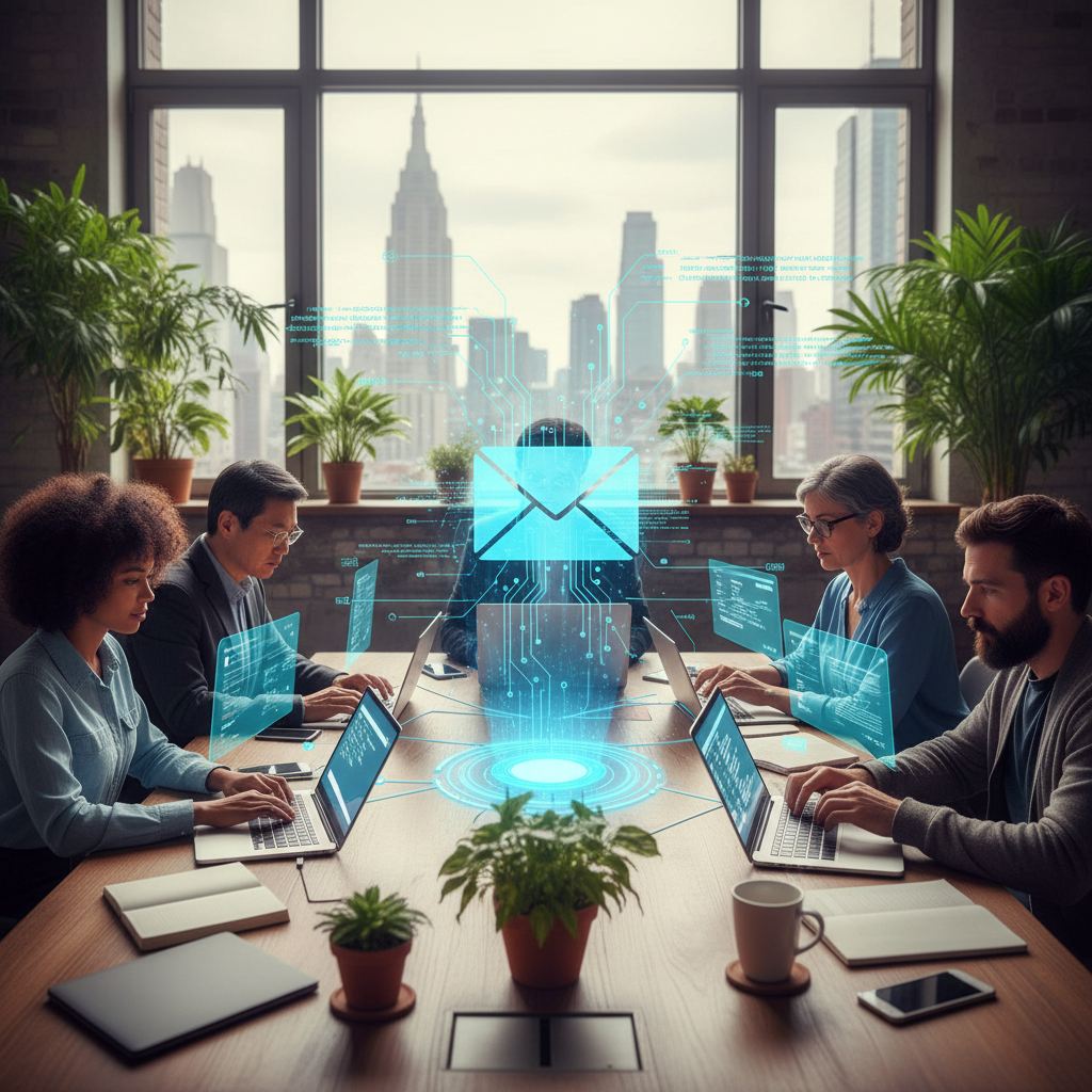 Image: A diverse professional team leveraging an AI-powered helper via email and digital dashboards, embodying new work culture trends.