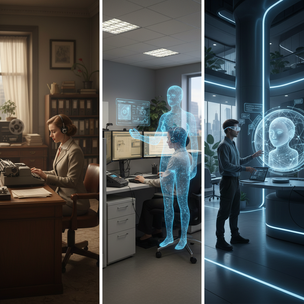 Image: Visual progression from analog secretaries to AI-powered teammates in the modern office.