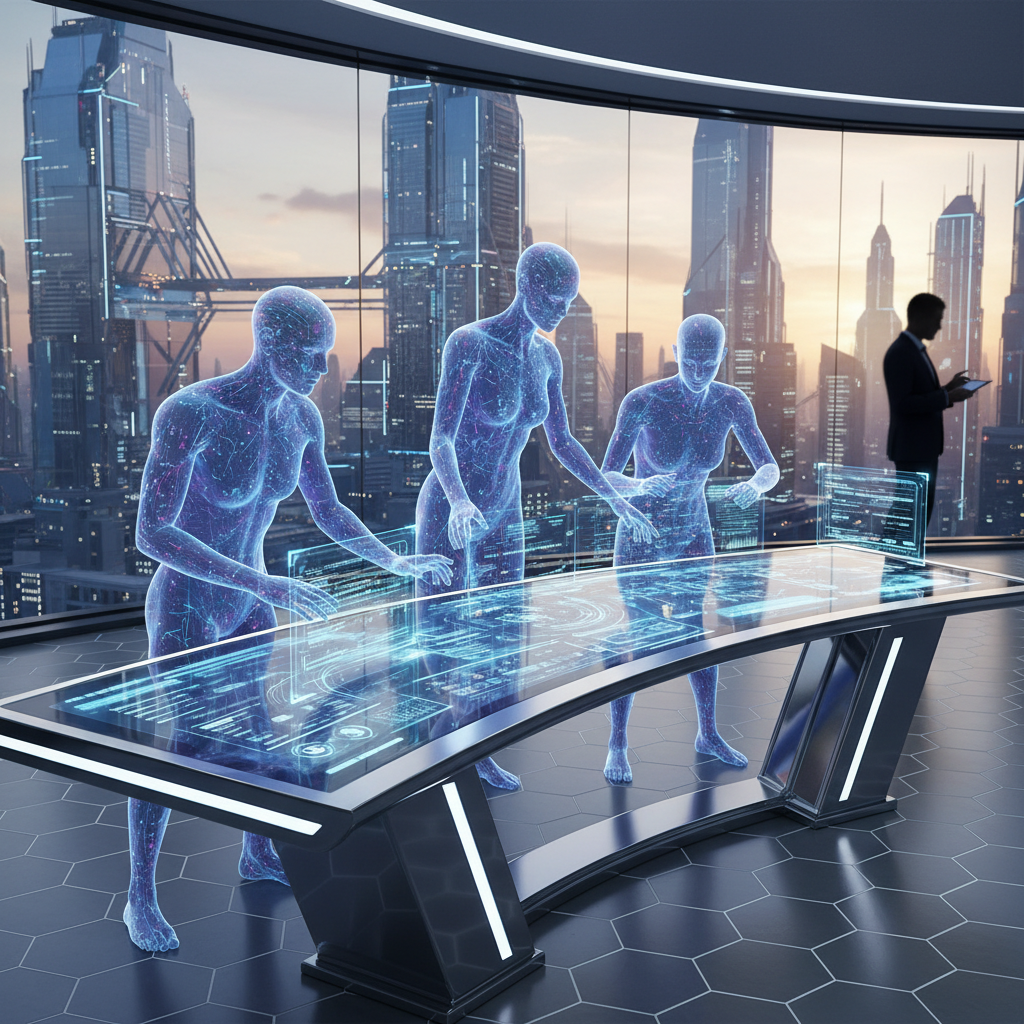 Alt text: Futuristic AI avatar and human analyst collaborating at a workstation, showing the blend of AI and human input to process data effectively.