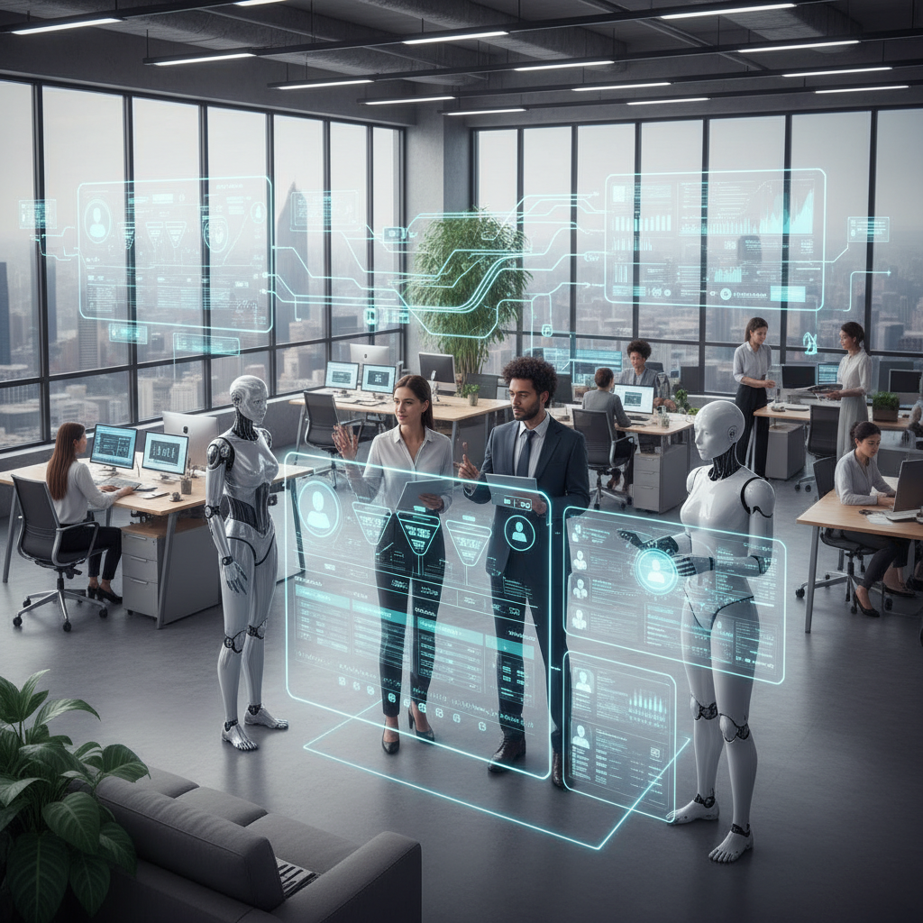 Photo: AI and human coworker collaborating on hiring dashboards with visible digital data flows in an open office.