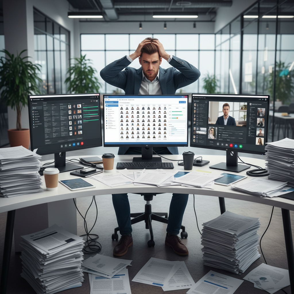 Photo: A stressed manager surrounded by cluttered resumes and digital screens displaying candidate profiles, tension in the atmosphere, modern office.