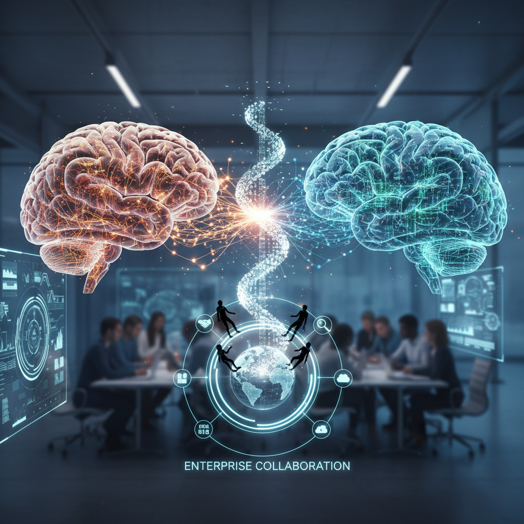 Alt text: Human and AI brains connecting conceptually, information helper collaboration, enterprise teammate