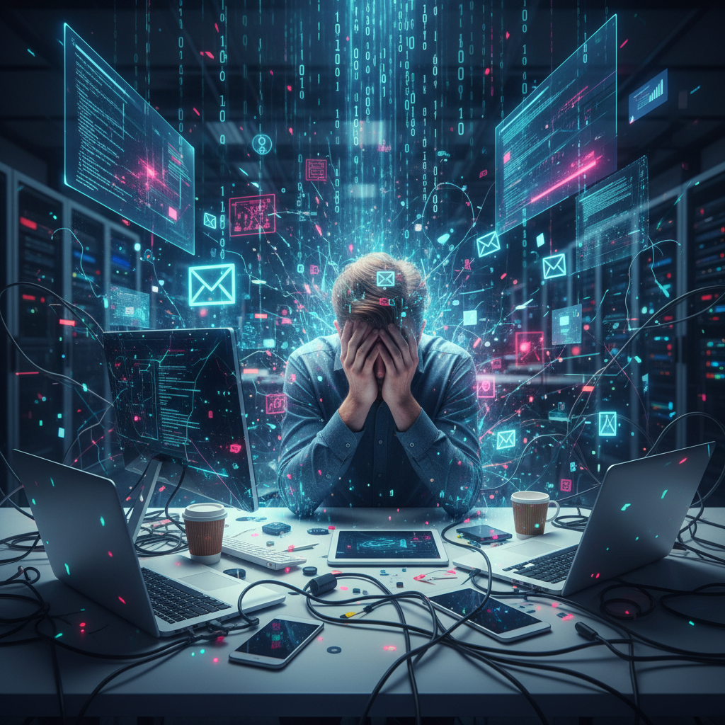 Alt text: Stressed worker overwhelmed by digital information chaos and endless notifications, information helper concept