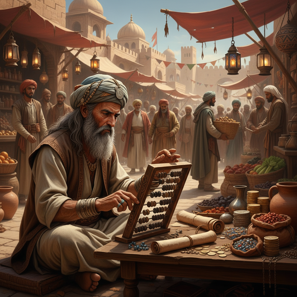 Alt text: Early information processor: abacus in use by merchant in ancient marketplace.